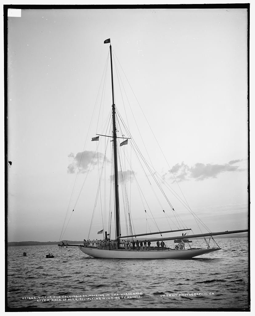 Document No 1039: Victorious Columbia at mooring in the horseshoe after race of Oct. 4, 1901, flying winning pennants. | |||||||||||||||