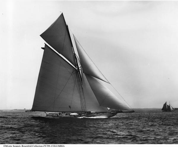 REF : 0 EDITION : 1901 DATE : 1903 COURSE : 0 DESCRIPTION SITE : 8x10 glass plate negative photographed by Charles Edwin Bolles in 1903. Image of 132' Herreshoff cutter COLUMBIA (built 1899 in Bristol, R.I.) underway. Visible in image: starboard beam view of the cutter COLUMBIA (G / 14) on port beam reach under gaff-rigged main and topsails, staysail, jib and flying jib, in background: another cutter, a two-masted schooner with main and topsail, foresail, staysail and jib and a motor launch near shoreline. CREDIT LINE: Mystic Seaport, Rosenfeld Collection, Charles Edwin Bolles photographer. For more information see: SLEEK, text by John Rousmaniere, p. 32 and 108-9. Handwritten on original negative sleeve: "Y399 / Box 40 / Columbia Box C4". Printed on original negative sleeve: "Subject.......................... / Property of 'YACHTING' / 38 PARK ROW / NEW YORK". NOTES AMERICA-SCOOP :LICENCE : Public domain |