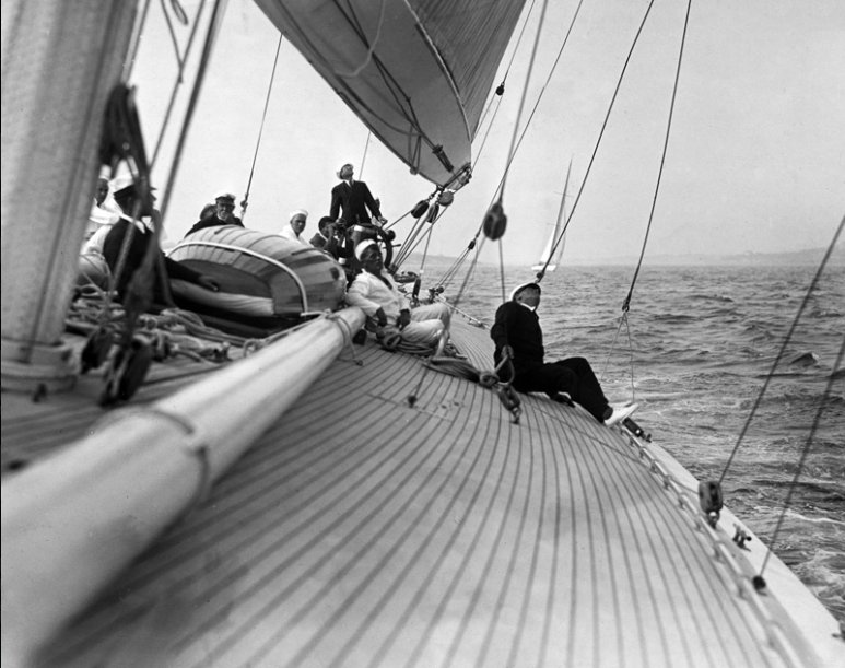 REF : 0 EDITION : 1930 DATE : COURSE : 0 DESCRIPTION SITE : A photograph from the Edwin Levick Collection, showing the deck of the Enterprise as the afterguard watches the sail trim. Harold Vanderbilt is at the wheel. NOTES AMERICA-SCOOP :LICENCE : Public domain |