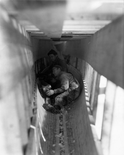 REF : 0 EDITION : 1934 DATE : COURSE : 0 DESCRIPTION SITE : Two men working on creating a mold for Rainbow's keel. On May the 15th 1934, the William Starling Burgess Design J-Class Rainbow was launched at the Herreshoff Yard in Bristol, Rhode Island. She was built to defend against Endeavour in 1934. Harold S. Vanderbilt skippered Rainbow with his tactician, W. Sherman Hoyt,in 1934 against T.O.M. Sopwith's Endeavour. Rainbow lost the first two races but won the last 3. NOTES AMERICA-SCOOP :LICENCE : Public domain |