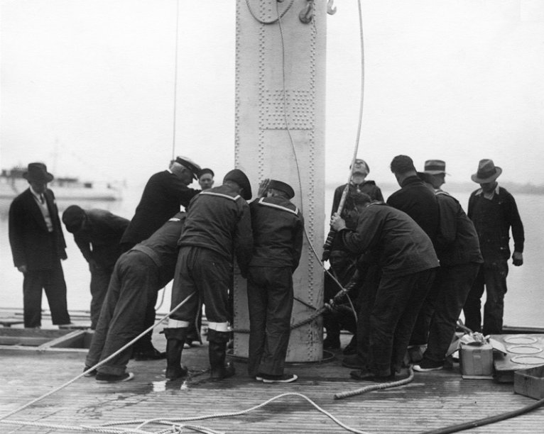 REF : 0 EDITION : 1934 DATE : 15 May 1934 COURSE : 0 DESCRIPTION SITE : A photograph from the Edwin Levick Collection showing the crew of the Rainbow "stepping the mast". Rainbow was built at the Herreshoff Manufacturing Company and owned by Harold Vanderbilt. NOTES AMERICA-SCOOP :LICENCE : Public domain |
