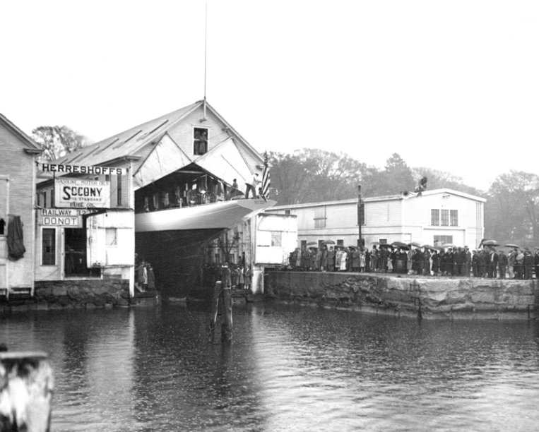 REF : 0 EDITION : 1934 DATE : 15 May 1934 COURSE : 0 DESCRIPTION SITE : A photograph from the Edwin Levick Collection showing the launching Rainbow with spectators looking on from the stone quay. On May the 15th 1934, the William Starling Burgess Design J-Class Rainbow was launched at the Herreshoff Yard in Bristol, Rhode Island. She was built to defend against Endeavour in 1934. Harold S. Vanderbilt skippered Rainbow with his tactician, W. Sherman Hoyt,in 1934 against T.O.M. Sopwith's Endeavour. Rainbow lost the first two races but won the last 3. NOTES AMERICA-SCOOP :LICENCE : Public domain |