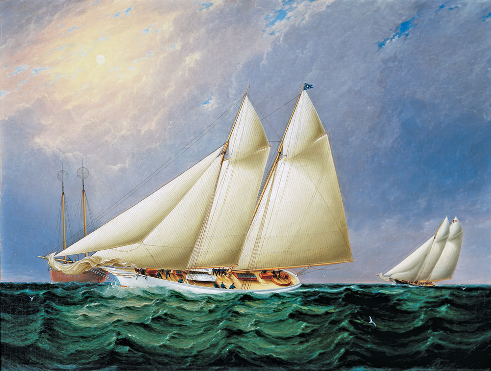 REF : 0 EDITION : 1876 DATE : 1876 COURSE : 0 DESCRIPTION SITE : Buttersworth depicted two more successful defenders of the America's Cup in Yachts Madeline and Sappho, Off Sandy Hook Lightship. In the center of the canvas Madeline, who claimed victory in 1876, sails on a sharp starboard keel, in front of the red Sandy Hook Lightship, which is likely acting as a race marker. Sappho won the Cup in 1871. NOTES AMERICA-SCOOP :LICENCE : Public domain |