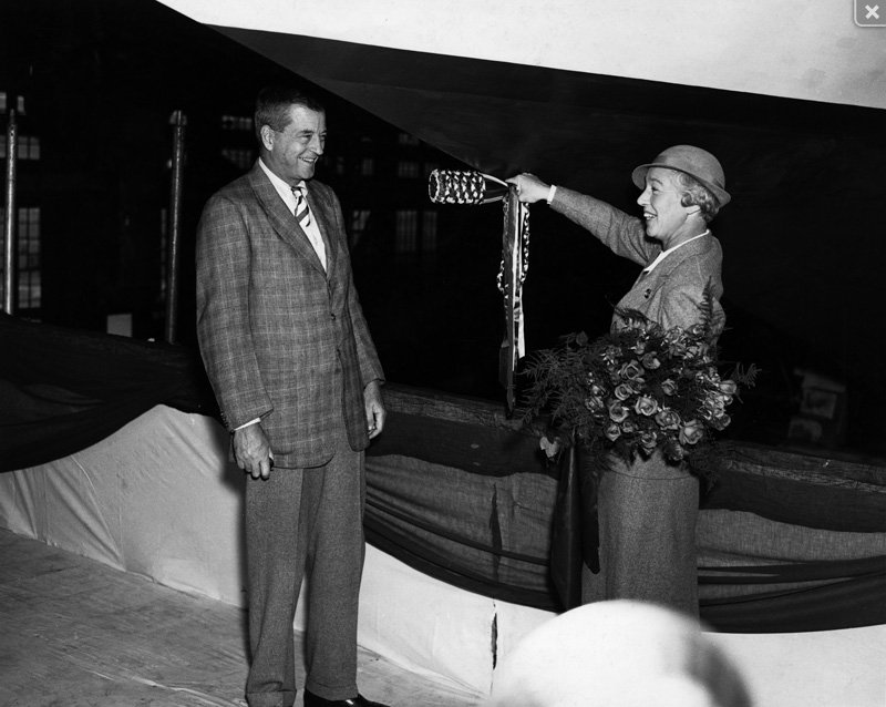 REF : 0 EDITION : 1937 DATE : 11 May 1937 COURSE : 0 DESCRIPTION SITE : Mr. And Mrs. Vanderbilt christen Ranger before she is launched out of the Bath Iron Works boathouse. Ranger was Harold Vanderbilt's third J-Class yacht, built soley for the America's Cup races. Although she was built during the depression, Vanderbilt spared no expense to ensure she was built for speed and endurance. LICENCE : Public domain |