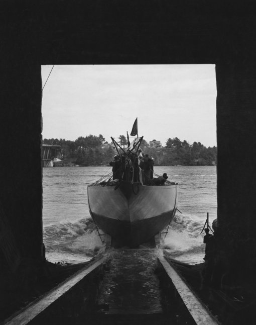 REF : 0 EDITION : 1937 DATE : 11 May 1937 COURSE : 0 DESCRIPTION SITE : Ranger's launch day, this shows her as she slides out of Bath Iron Works for the first time. Ranger was Harold Vanderbilt's third J-class yacht, and he commissioned her soley for the America's Cup races. Ranger was built completely new with the exception of her winches, mainsail, and rigging which came from Rainbow. LICENCE : Public domain |