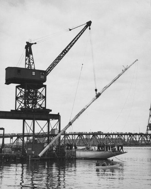REF : 0 EDITION : 1937 DATE : 11 May 1937 COURSE : 0 DESCRIPTION SITE : Stepping the mast on Ranger. Just after being launched, as she was under tow to Massachusetts, her mast fell apart. However, Vanderbilt was able to take her to the Herreshoff yard in Bristol to install a new/old mast. LICENCE : Public domain |
