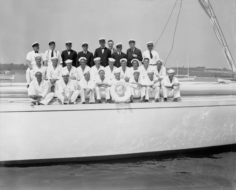 REF : 0 EDITION : 1937 DATE : 05 Aug 1937 COURSE : 0 DESCRIPTION SITE : A photo of the Ranger Crew on the deck of the J-boat after winning the 1937 America's Cup. Ranger was commissioned by Harold "Mike" Vanderbilt solely for the purpose of defending the America's Cup. From the Edwin Levick Collection. NOTES AMERICA-SCOOP :LICENCE : Public domain |