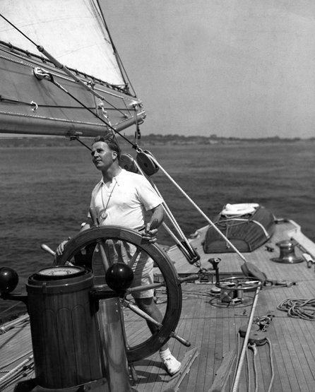 REF : 0 EDITION : 1937 DATE : 31 May 1937 COURSE : 0 DESCRIPTION SITE : Arthur Knapp Jr. at the wheel of Ranger. Knapp was considered one of the best sailors on Long Island Sound. He was also the chief sailmaker for Ranger. From the Edwin Levick Collection. NOTES AMERICA-SCOOP :LICENCE : Public domain |