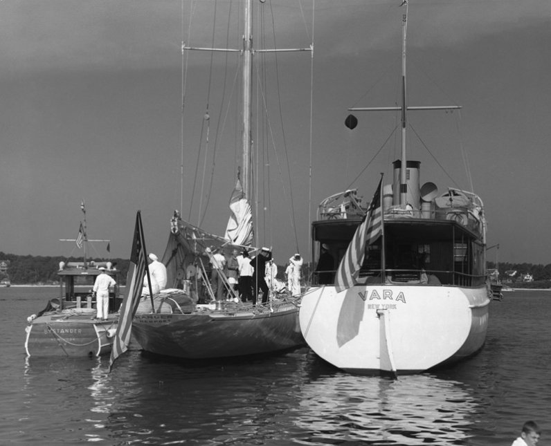 REF : 0 EDITION : 1937 DATE : 31 May 1937 COURSE : 0 DESCRIPTION SITE : Ranger (middle) was commissioned by Harold Vanderbilt solely for the purpose of defending the America's Cup in the 1937 races. Bystander (left) was the yacht's tender while in the harbor, and Vara (right) was the home of Ranger's afterguard during the racing season. Ranger became a successful defender during the America's Cup races. From the Edwin Levick Collection. NOTES AMERICA-SCOOP :LICENCE : Public domain |