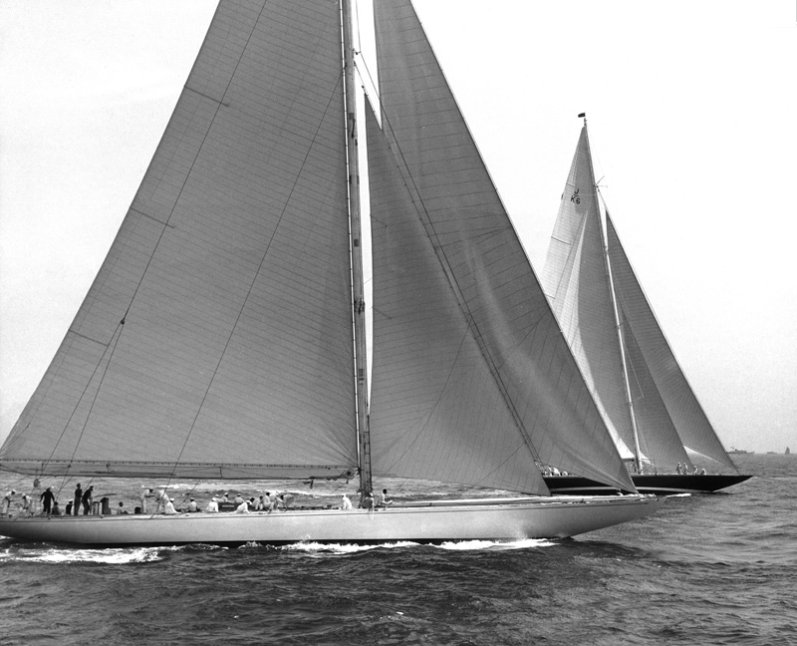 REF : 0 EDITION : 1937 DATE : 05 Aug 1937 - 11:39 COURSE : 4 DESCRIPTION SITE : A photo from the fourth race of the 1937 America's Cup race. Ranger is in the foreground and Endeavour II is in the background. At the start of the race Endeavour II showed a faster start; however, she could never match Ranger's overall speed or the skill of Vanderbilt's leadership. From the Edwin Levick Collection. NOTES AMERICA-SCOOP :Endeavour II n'est pas mieux parti puisqu'il a fait un faux départ. LICENCE :Public domain |