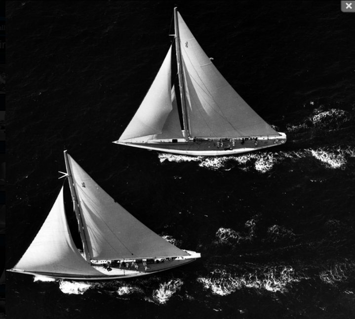 REF : 0 EDITION : 1934 DATE : COURSE : 0 DESCRIPTION SITE : A photograph from the Edwin Levick Collection showing a birds eye view of the Weetamoe and Rainbow racing to determine who would be the defender in the 1934 America's Cup races. NOTES AMERICA-SCOOP :LICENCE : Public domain |