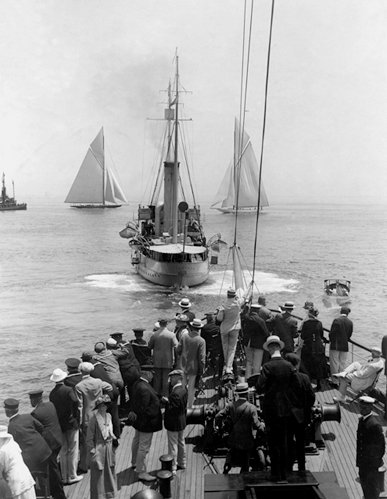 REF : 0 EDITION : 1920 DATE : 20 Jul 1920 - 12:10 COURSE : 3 DESCRIPTION SITE : Spectator boats observe Shamrock IV and Resolute jockeying for the start off Sandy Hook, New Jersey. The vessel in the foreground is Tuscarora NOTES AMERICA-SCOOP :LICENCE : Public domain |