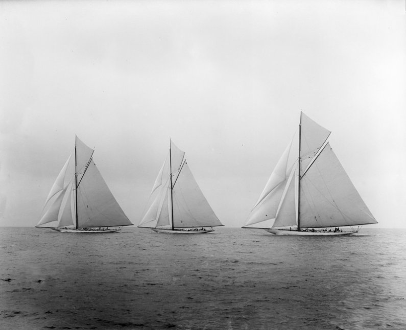 REF : 0 EDITION : 1903 DATE : COURSE : 0 DESCRIPTION SITE : A photograph from the Edwin Levick Collection, taken by August Loeffler (1864-1942), shows the Reliance, Columbia and Constitution (from left to right) competing for the chance to race in the 1903 America's Cup. NOTES AMERICA-SCOOP :LICENCE : Public domain |
