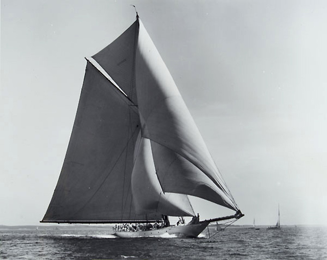 REF : 0 EDITION : 1893 DATE : 1893 COURSE : 0 DESCRIPTION SITE : 8 x 10 gelatin silver print taken by James Burton on Long Island Sound in 1893, and printed by Rosenfeld and Sons, date unknown. Starboard bow view of the cutter VIGILANT under sail. VIGILANT was a U.S. America's Cup defender in 1893. She was the first Herreshoff designed defender and the last centerboard defender. She was built by Herreshoff Manufacturing Co. in Bristol, RI 1893. Stamped on back in blue rectangular box: "MORRIS ROSENFELD AND SONS / PHOTOGRAPHIC ILLUSTRATORS / 163 WEST 23rd ST., N.Y. 10011 / Phone: 989-2404". Handwritten on back: "Vigilant - 1893". Original negative number B.1984.187.646. NOTES AMERICA-SCOOP :LICENCE : Public domain |