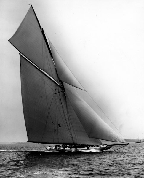 REF : 0 EDITION : 1903 DATE : 1903 COURSE : 0 DESCRIPTION SITE : 10x8 glass negative photographed by James Burton in 1903 of the cutter RELIANCE, sail #G16, sailing on Long Island Sound with all sails out, starboard bow view on a port tack with deck visible. RELIANCE was 143' and built to be the America's Cup defender in 1903. She was the largest America's Cup vessel ever built by Herreshoff Manufacturing Company of Bristol, Rhode Island from designs by Nathanael Greene Herreshoff. Handwritten neg. sleeve info.: "B596 / Reliance / Box 37". Handwritten info. from negative margins: "596 / Reliance / 33 / 596". CREDIT LINE: Mystic Seaport, Rosenfeld Collection, James Burton photographer. NOTES AMERICA-SCOOP :LICENCE : Public domain |