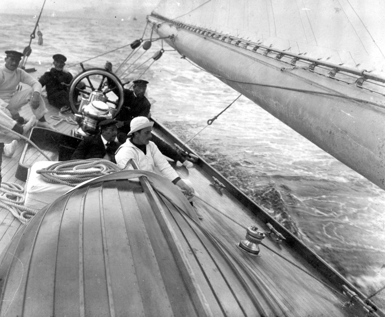 Document No 1629: View of Shamrock's helm and spar, with crew. | |||||||||||||||