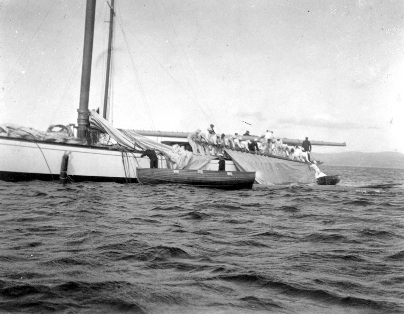 Document No 1652: Row boats beside Shamrock with crew on deck and masts down. | |||||||||||||||
