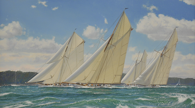 REF : 0 EDITION : 1899 DATE : 1899 COURSE : 0 DESCRIPTION SITE : 10x18 inch oil on panel This painting depicts the Herreshoff Americas Cup Defenders during the 1899 NYYC annual cruise. Defender, Columbia and Vigilant along with the schooner Corona original built as Colonia to defend the Americas Cup in 1893. The 1893 built defender Colonia defeated by Vigilant in the trials is shown as a schooner. In the principle competition to see which yachts would become the leading contenders to defend the America's Cup each season, the Goelet Cup Races off Newport Road Island were an annual event of the New York Yacht Club and invited competitors. The first was held in 1882, and they raced for a perpetual trophy held by the Club, and annual custom trophy cups designed by Tiffany & Co. of New York with a $1,000 prize for the winning sloop and schooner. p>The 1887 race saw a large fleet sail the race. Here, STILETTO, PURITAN, VOLUNTEER, AMERICA, MISCHIEF, NORSEMAN and ELECTRA break the starting line between Fort Adams and the aptly named “Dumpling Rock” of Newport Harbor. VOLUNTEER proved to be the class yacht of the race and 1887 in her maiden season, winning the race by more than 8 minutes and losing only one match the entire year. Shane Couch's historic research is a strong asset to what may only be labeled a superb artistic painting. Technically precise, his yachts hold all of their design excellence and grace, while noting if found wanting in the sea and sky atmosphere.VOLUNTEER won the right to defend the America's Cup in 1887 by defeating a Boston syndicate's MAYFLOWER and proved a good choice, as she handily defeated the English Challenger THISTLE in the series over the New York Yacht Club's harbor and outer courses off Sandy Hook. She and her contemporaries are well remembered herein. NOTES AMERICA-SCOOP :LICENCE : Autorisation de l'auteur acceptée le 25/03/2019 |