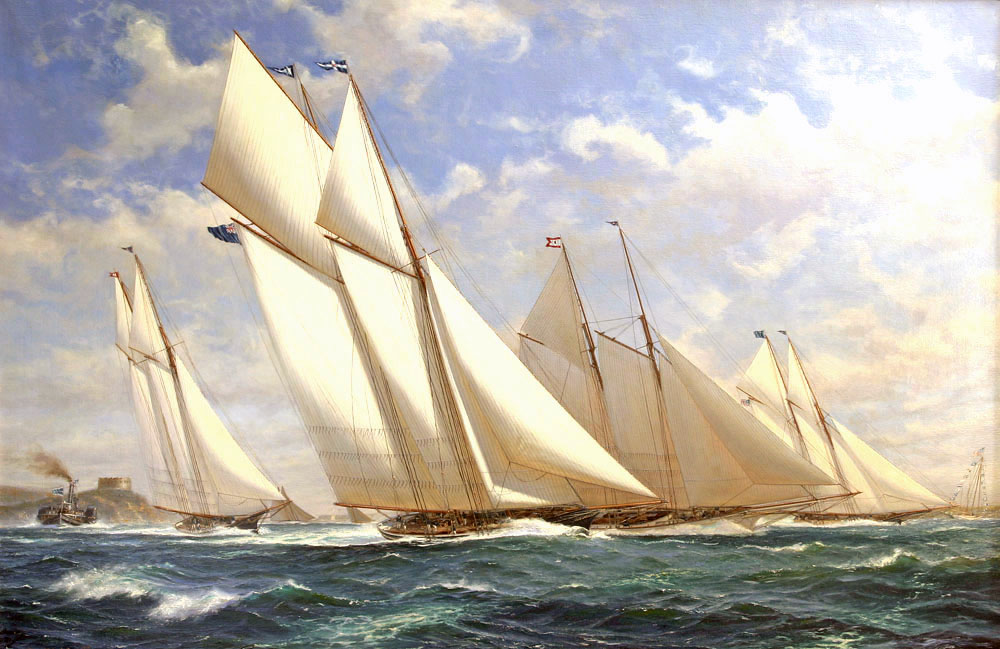 REF : 0 EDITION : 1870 DATE : 1870 COURSE : 0 DESCRIPTION SITE : In an event that rightly may be called the most thrilling schooner yacht race on record, mere months after the First Defense of the America’s Cup, the American Schooner MAGIC beat CAMBRIA by a mere 26 seconds. Starting off Fort Adams in Newport, Rhode Island, the course laid south to a marking buoy off Block Island and back, over a course of almost 40 miles. Also sailing in the race were the yachts PHANTOM, TITLE WAVE, MADELINE, IDLER, HALYCON and AMERICA. They race for the inaugural cup that CAMBRIA’s owner James Ashbury put up as a prize in his first voyage across the Atlantic Ocean. The painting is a masterwork by Couch, with superb, light, shadow and drama. The depiction of the sea is a superior presentation, rivaling all others. With inspection, the layers of exacting work are revealed, but blend to a naturally beautiful composition. The sky work is a homage to the best of Montague Dawson, and the yachts with their deck in view and bows breaking swells is reminiscent of the quality of James E. Buttersworth. CAMBRIA was built by Michael Ratsey of Cowes in 1868 for Ashbury. She proved quick and fast, winning several races in home waters and the Second Transatlantic against James Gordon Bennett, Jr.’s DAUNTLESS. Still, here and in the 1870 America’s Cup Race, she was defeated by New York Yacht Club’s Schooner MAGIC, which was built as the sloop MADGIE in 1857 and converted in 1859 well after AMERICA’s success overseas in 1851. Oil on canvas 40x60inch NOTES AMERICA-SCOOP :LICENCE : Autorisation de l'auteur acceptée le 25/03/2019 |