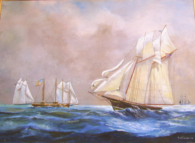REF : 0 EDITION : 1876 DATE : COURSE : 2 DESCRIPTION SITE : Americas cup boat Madeline. This is my attempt at an already existing painting (now out of copyright). I just liked the way the artist originally depicted the luffing sails. This painting was fun to do, but was not my original idea. This was the third defense of America's Cup, in which America was successful in defending against the Canadian yacht Countess of Dufferin. 24" x 36" Stretched Giclee Print --- $250.00 . - "Paintedseascapes.com" watermark is not on the print. It is only on our photos for copyright protection. NOTES AMERICA-SCOOP :LICENCE : Autorisation en cours |