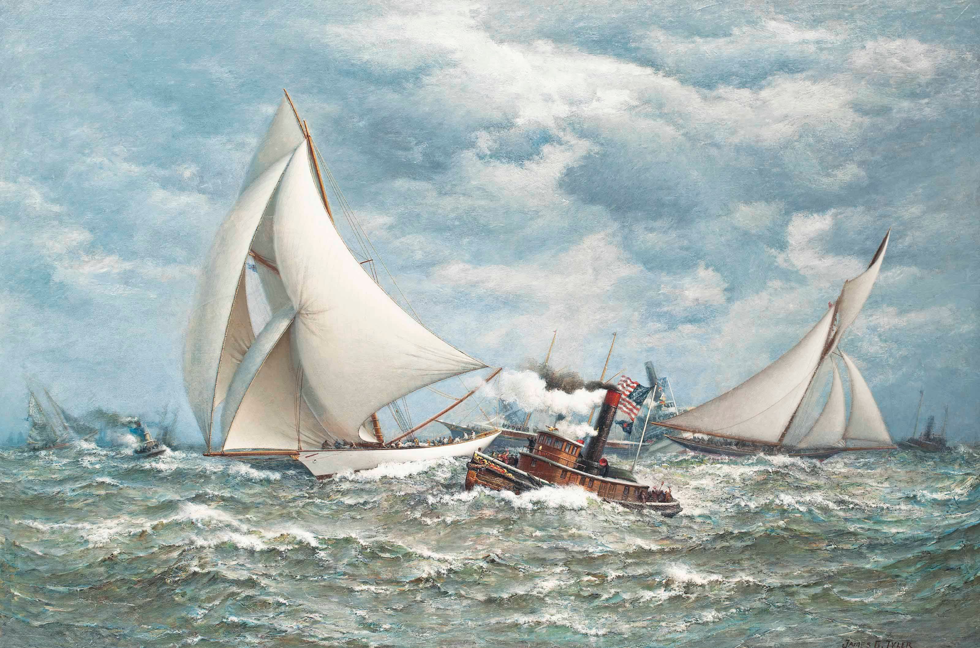 This magisterial and spirited work shows the second race with Volunteer (leading, seen on the left) and Thistle gybing downwind. The New York Yacht Club committee boat is in front of them and numerous spectator craft are astern, witnessing one of yachting's grandest events during the so-called 'Golden Age of Yachting'.