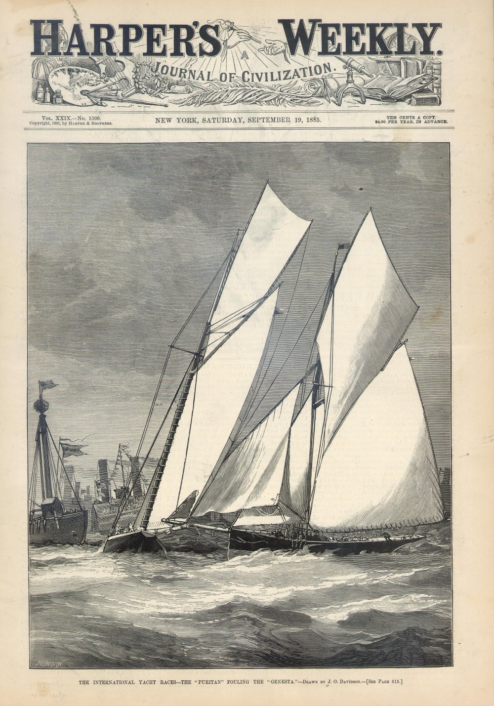 REF : 0 EDITION : 1885 DATE : 19 Sep 1885 COURSE : 0 DESCRIPTION SITE : J.O. Davidson. "The International Yacht Races. The Puritan Fouling the Genesta." New York: Harper's Weekly, September 19, 1885. Wood engraving. 11 3/8 x 9 1/8. $125 NOTES AMERICA-SCOOP :LICENCE : Public domain |