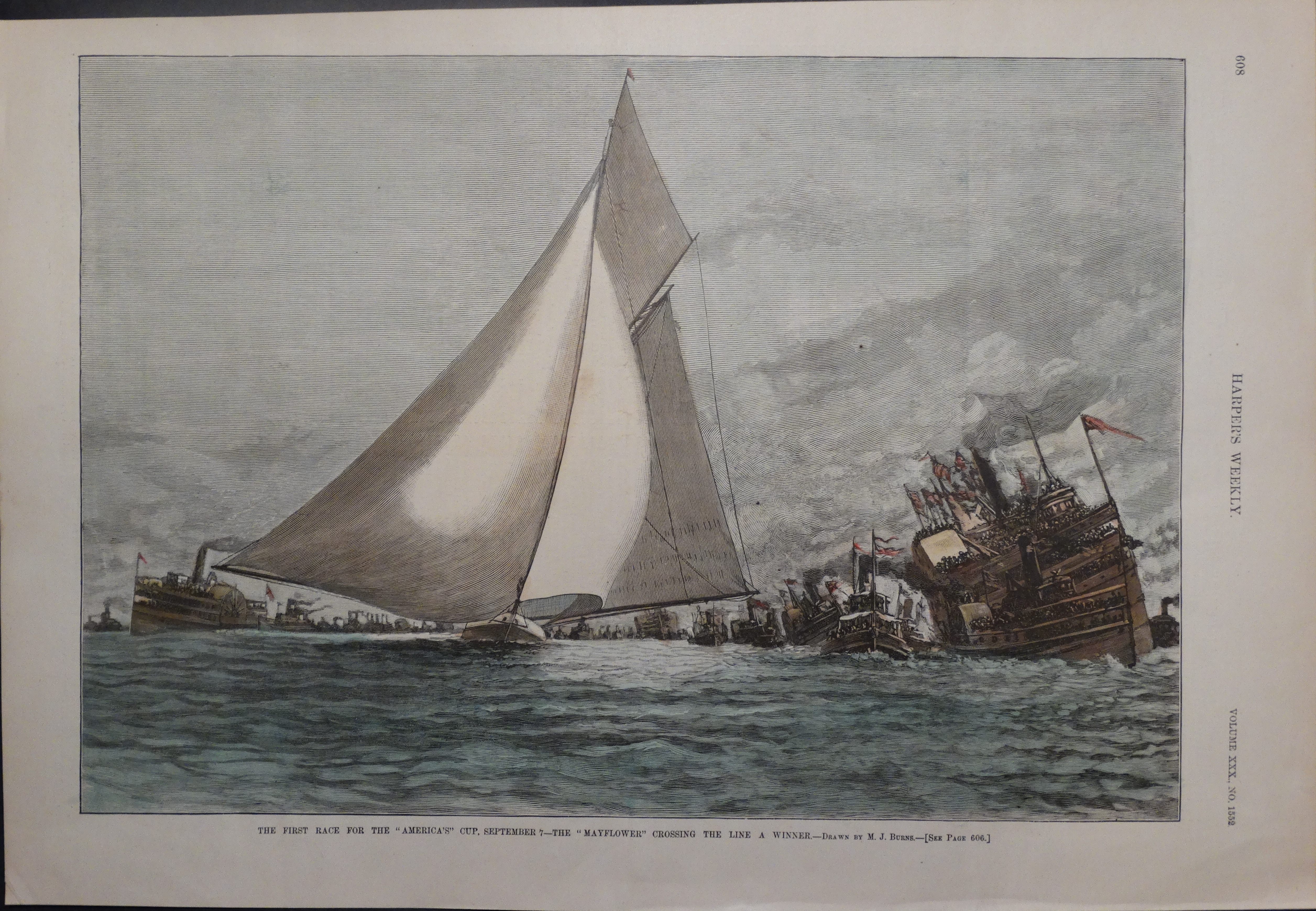 REF : 0 EDITION : 1886 DATE : 07 Sep 1886 - 16:23 COURSE : 1 DESCRIPTION SITE : Hand colored wood engraving from Harper's Weekly showing, "The Race for the "America's" Cup, September 7 -- The "Mayflower" Crossing the Line A Winner." NOTES AMERICA-SCOOP :LICENCE : Public domain |