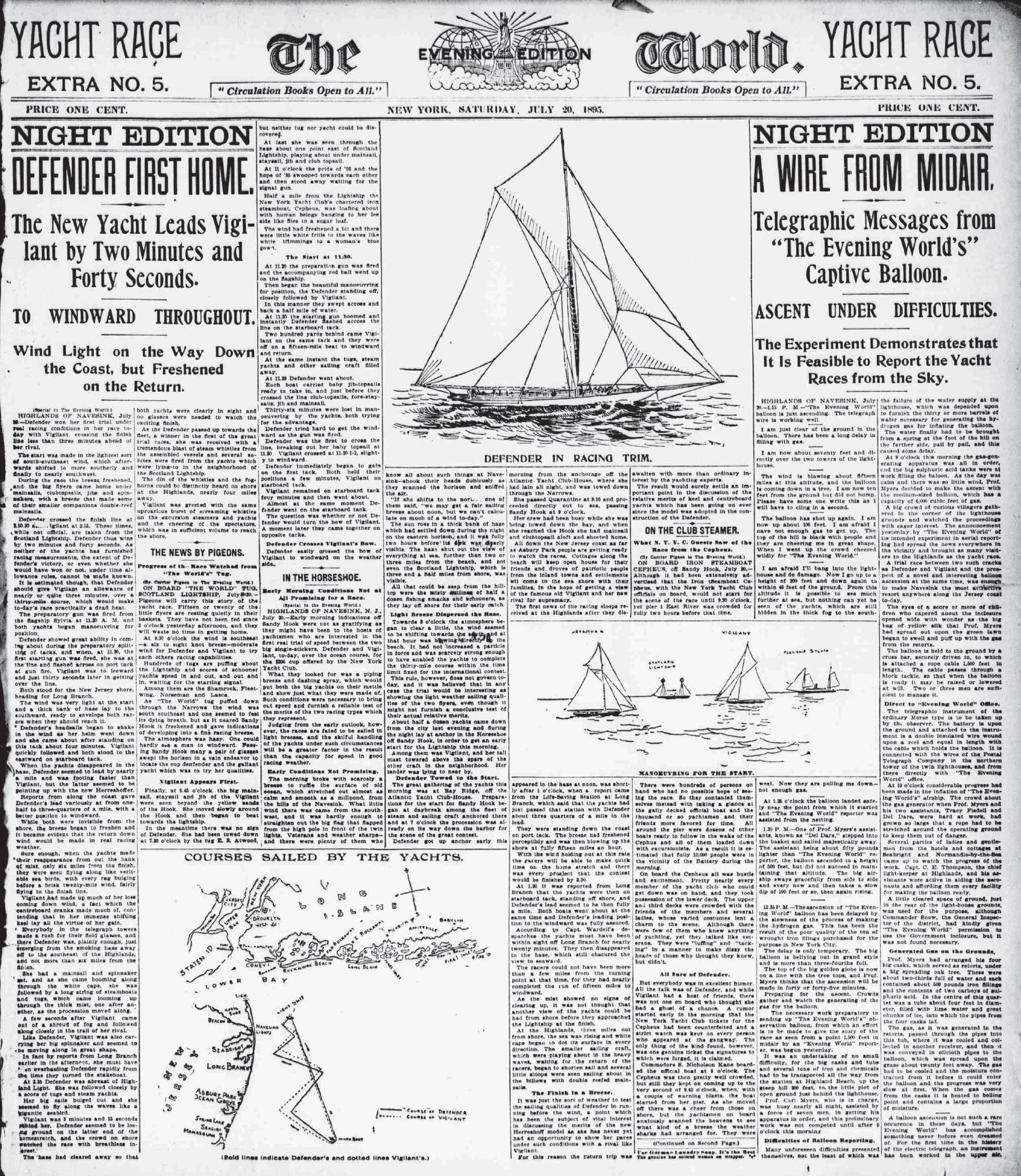 REF : 0 EDITION : 1895 DATE : 20 Jul 1895 COURSE : 0 DESCRIPTION SITE : NOTES AMERICA-SCOOP : DEFENDER'S FIRST RACE; Vigilant Beaten by Nearly Three Minutes on a 30-Knot Course. THE DEFENDER WAS BADLY HANDLED Overstood the Mark Nearly Five Minutes in the Thrash to WindwardThe new cutter which is to be the defender of the America's Cup in the yacht races against the British cutter Valkyrie had her first trial over the outside course yesterday. The Vigilant, which has successfully defended the cup against the previous Valkyrie, was used as a trial boat. LICENCE :Public domain |