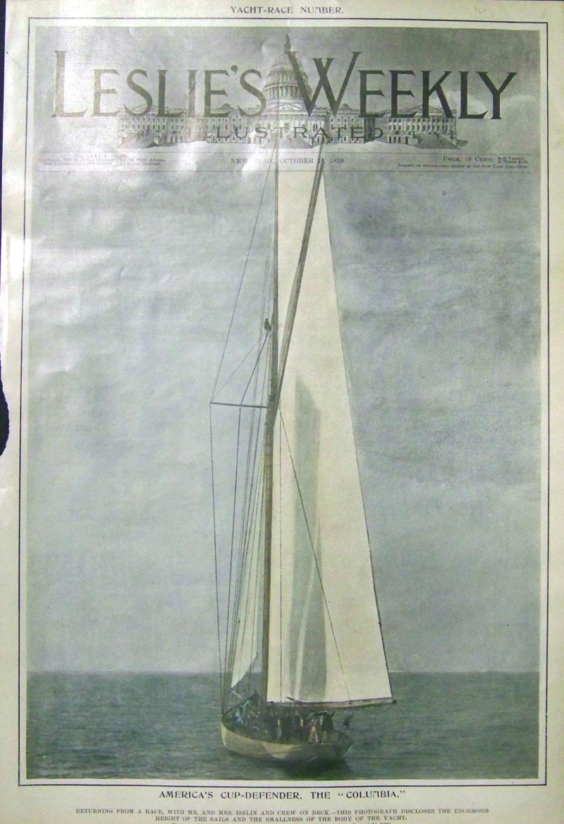 REF : 0 EDITION : 1899 DATE : 21 Oct 1899 COURSE : 0 DESCRIPTION SITE : 1899 Hand colored half-tone from Leslie's Weekly Illustrated titled, "America's Cup- Defender, The "Columbia" Returning from a Race with Mr. and Mrs. Iselin and Crew on Deck." This half-tone, taken from a photograph, discloses the enormous height of the sails and the smallness of the body of the yacht. NOTES AMERICA-SCOOP :LICENCE : Public domain |