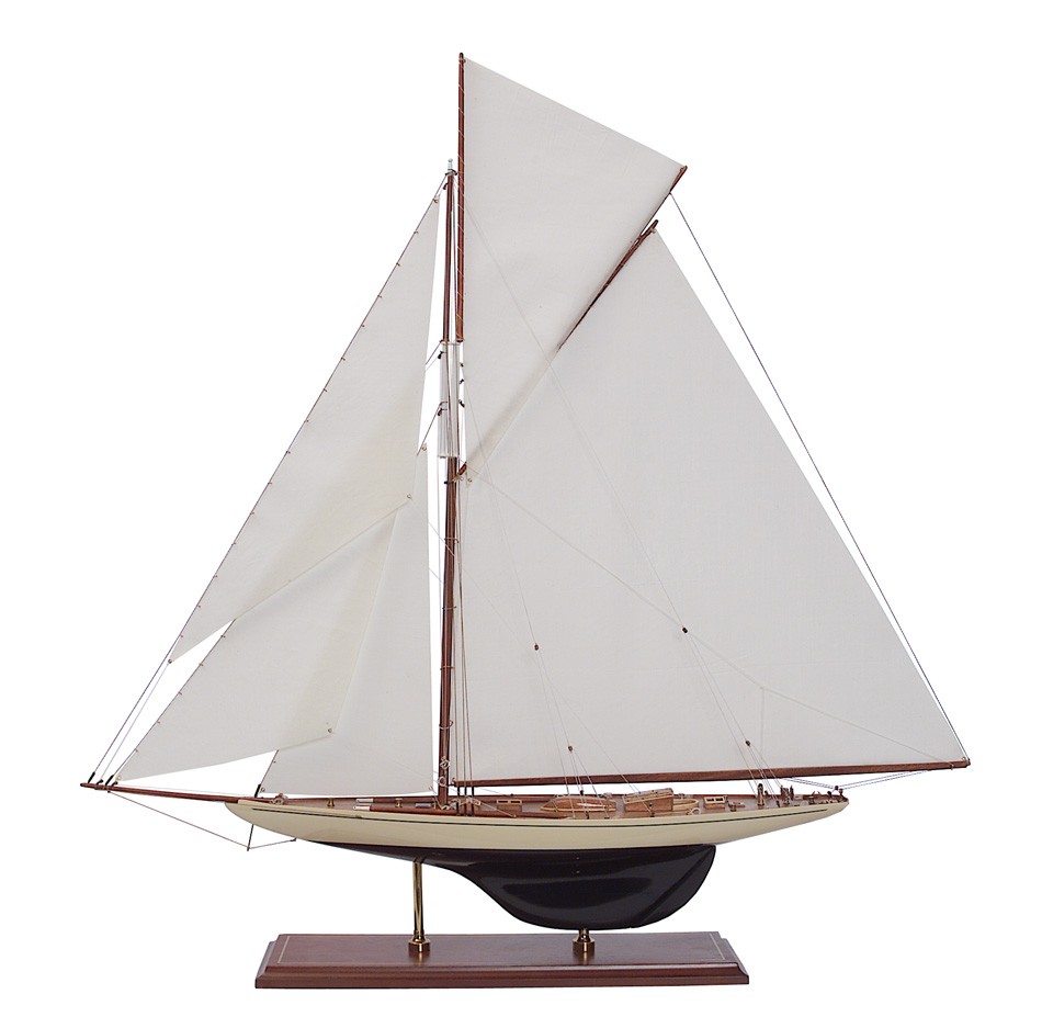 REF : 0 EDITION : 1895 DATE : COURSE : 0 DESCRIPTION SITE : 76 cm L x 69 cm Hgh Plank on bulkhead construction, we only build small production batch of 10 units. Exclusive hand made construction, it has been built from the the best wood essences and innovative materials. This model of Defender combines the careful execution of every detail with the high quality of the materials and the craftsmanship. Deck fittings are amazing and very detailed. Model has beige topsides, black cove stripe and dark blue bottom paint. Also comes with varnished bottom upon request . Model comes with cotton sails and is ready to display. It is mounted with brass pedestals on a high quality... NOTES AMERICA-SCOOP :LICENCE : Autorisation en cours |