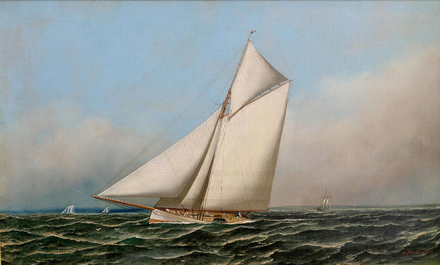 44 1/2 Inches Framed A painted portrait of the Racing Yacht MAYFLOWER, directly from the year of her most glorious campaign for owner General Charles J. Paine in the 1886 Defense of the America's Cup. Having defeated .PRISCILLA and the New York Club's other potential defenders in the August trials, MAYFLOWER met Lieut. William Henn's GALATEA, the first steel challenger for the Cup, on Sept. 7. In light airs, MAYFLOWER handedly defeated the Royal Northern Yacht Club of Scotland's challenger, both on the inside and outside New York courses. A sensation of movement is achieved by the artist, the racing cutter is raked back at speed under a sky brightening with the rising marine layer, while the water is very active. Paine's private signal flies high, and his royal blue coated presence is noticeable amongst the crew dressed in whites. Two schooners and another racing cutter share the water off New York. Built in 1886 by George Lawley's City Point Yard in Boston from the design of Edward Burgess, MAYFLOWER followed their successful syndicate project led by Paine and J. Malcolm Forbes with PURITAN, the defender of the 1885 challenge. They both possessed deeper hulls with lead ballast on the outside, overhanging sterns and modified cutter rigs, greatly changing yacht design to a far more capable boat in all weather. MAYFLOWER was 100' with a 85½' waterline, 23½' beam and a 9'9" draft that extended down 20' with the centerboard. She was not successful in her first matches, but after some adaptations, by August she was unbeatable, winning not only the trials and the Cup, but every match she raced the rest of the year. Paine most likely directly commissioned this great portrait in her honor and lasting memory. NOTES AMERICA-SCOOP :LICENCE : Public domain |