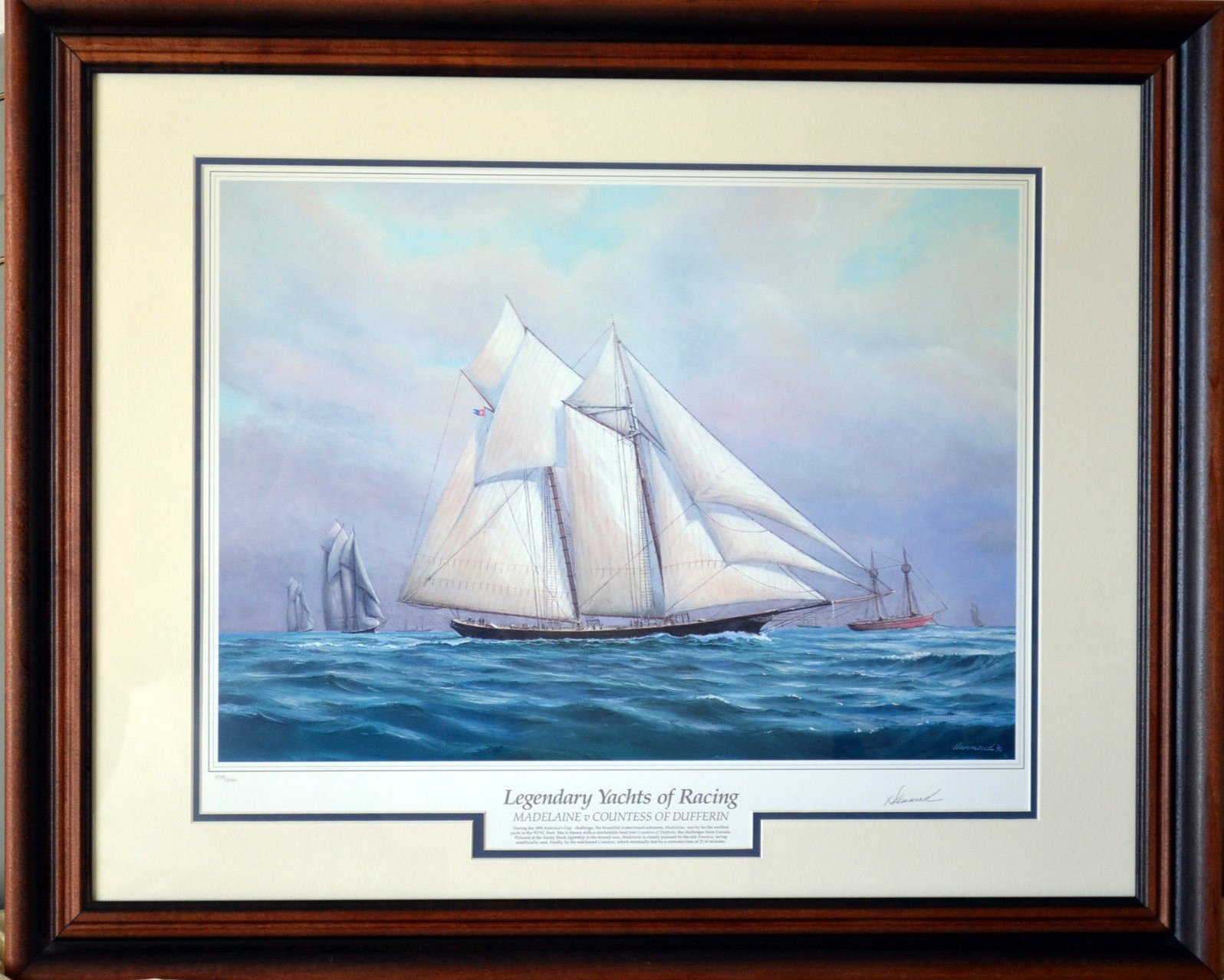 REF : 0 EDITION : 1876 DATE : 1876 COURSE : 0 DESCRIPTION SITE : Up for auction is a set of three Legendary Yachts of Racing lithographic prints by the artist Cris Hammond The lithographs are individually numbered, On the bottom right corner of the painting appears to be an original signature by Cris Hammond.These are extremely beautiful prints from paintings by Mr Hammond, They are not framed but they each come with professional mounts and the overall measurments are 710mm x 560mm, These will be an great addition for anyone who is a fan of the Sailing or the Maritime Series by Chris Hammond, MADELEINE v COUNTESS OF DUFFERIN: During the 1876 America's Cup challenge, the beautiful center-board schooner, Madelaine, was by far the swiftest yacht in the NYYC fleet. She is known with a comfortable lead over Countess of Dufferin, the challenger from Canada. Pictured at the Sandy Hook lightship in the second race, Madelaine is closely pursued by the old America, racing unofficially, and, finally, bu the outclassed Countess, which eventually lost by a corrected time of 27.14 minutes.. Limited Edition 2384/5000 NOTES AMERICA-SCOOP :LICENCE : Autorisation de l'auteur acceptée le 11/04/2019 |