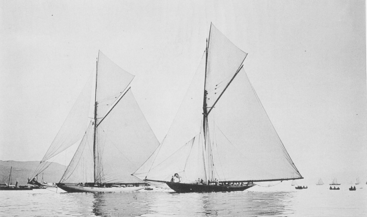 REF : 0 EDITION : 1893 DATE : 09 Jul 1894 COURSE : 9 DESCRIPTION SITE : Vigilant and Royal Yacht Britannia becalmed at the Royal Clyde YC Regatta, July 9, 1894. The photo appeared in a supplement to The Yachtsman no 191, December 1894. This is a Photomezzotype by the London Stereoscopic Co, and the photo was taken by Mclure & Macdonald. Three steam yachts, other sailing craft and even rowing boats can be seen in the background. NOTES AMERICA-SCOOP :NO LUCK FOR THE VIGILANT; THE BRITANNIA