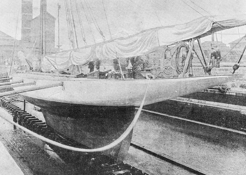 REF : 0 EDITION : 1893 DATE : 1893 COURSE : 0 DESCRIPTION SITE : Vigilant in dry dock. The shot is listed as photo 8589 by West & Sons of Southsea, and Jeff believes it probably appeared in Yachting World. It shows a clear view of the hull and keel, rudder, boom horse, wheel, binnacle, companionway, lifting gear on gaff, skylights and ship's boat. There are two gentlemen on the dock, one in top hat, tails and walking stick. The other with full white beard, bum-freezer jacket and cap and what looks like an umbrella…> NOTES AMERICA-SCOOP :LICENCE : Public domain |