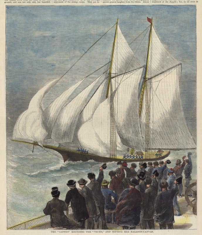 "Sappho" Rounding the "Victis," and Steeing her Balloon-Canvas.