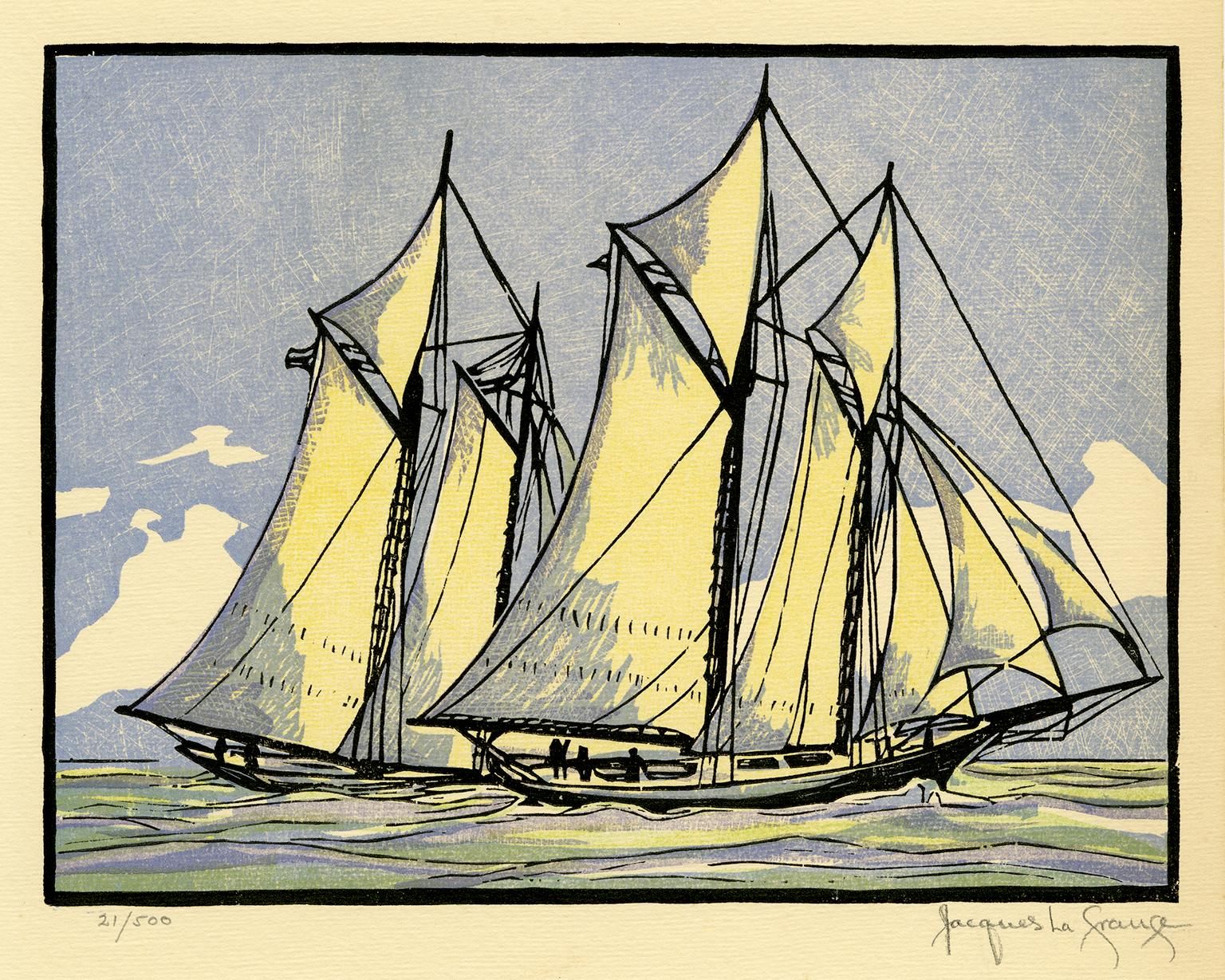 REF : 0 EDITION : 1871 DATE : 21 Oct 1871 COURSE : 4 DESCRIPTION SITE : Jacques La Grange, 'Sappho Passes Livonia, 1871', color woodcut, edition 500, 1934. Signed and numbered '21/500' in pencil. A fine impression, with fresh colors, on cream wove paper, with margins (3/8 to 1 7/8 inches), in excellent condition. A work from La Grange’s celebrated series of woodcuts 'Drama and Color in the America's Cup Races'. 'Sappho' was one of two defender yachts at the second America's Cup challenge (1871), stepping in when defender 'Columbia' was damaged in the third race. 'Livonia' was a new yacht designed by Britisher William Townsend based on the lines of 'America' and brought to the race by James Lloyd Ashbury in his second failed attempt to take the Cup back to England. 'Livonia' was able to win only one of the five races of the 1871 America's Cup. NOTES AMERICA-SCOOP :LICENCE : Public domain |