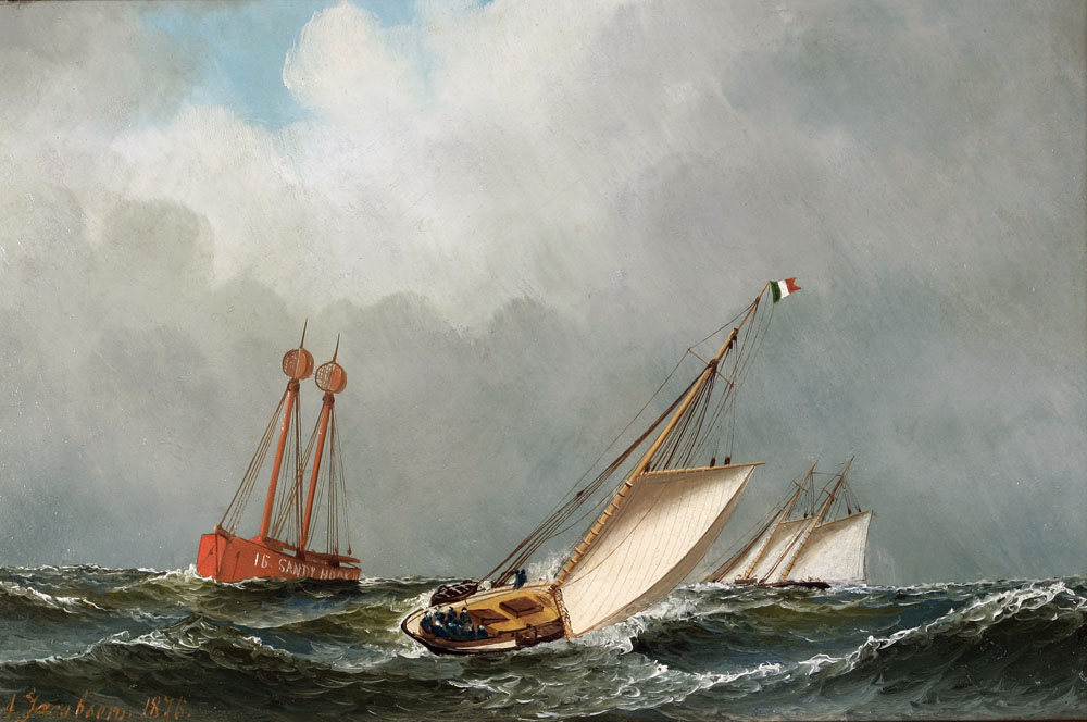 REF : 0 EDITION : 1870 DATE : 1876 COURSE : 0 DESCRIPTION SITE : Oil on Board - Dated 1876 An important pair of very early and artistically striking works by renown New York area marine artist Antonio Jacobsen, these two period yacht racing narratives have much to celebrate. The finest racing schooners, SAPPHO and DAUNTLESS, with the champion Sloop VISION as the primary subjects are added to with the renown and often used starting/finishing point of the Sandy Hook Lightship in both paintings. These period paintings are similar to the works of James E. Buttersworth from this historic era of American yachting. In his vast output, yacht depictions of races are Jacobsen's most sought after and desirable. When you have yachts that sailed in famous defenses of the America's Cup, they combine the historic and artistic. DAUNTLESS finished ahead of the English challenger CAMBRIA in the First Defense in 1870, her first year after conversion for her dynamic and infamous owner, J. Gordon Bennett, Jr. The actual final winner of the 1871 challenge, SAPPHO, twice defeated LIVONIA after COLUMBIA won the first two matches, lost the third, and was replaced. Her owner, William Douglas and Bennett were close friends and competitors, and both sailed their yachts and crews to compete in English waters. VISION ran successfully against yachts of her class for years as a member of the New York Yacht Club. Designed by the famous Captain Bob Fish, it is recorded that she was the “shoalest craft ever built”. Each of these famous yachts sailed for years in New York Yacht Club regattas and private matches. NOTES AMERICA-SCOOP :LICENCE : Public domain |
