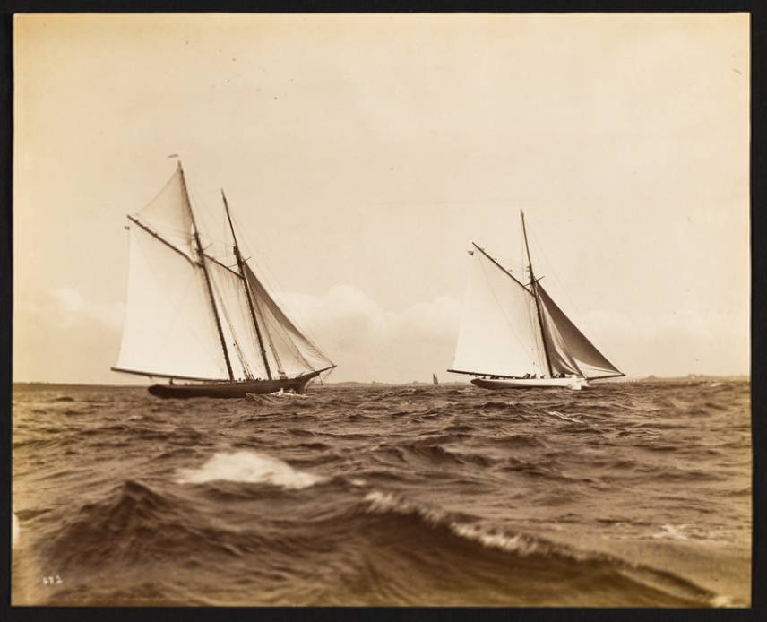 REF : 0 EDITION : 1885 DATE : 03 Aug 1885 COURSE : 0 DESCRIPTION SITE : Fortuna was a wooden keel schooner designed by A. Cary Smith and bult by C. & R. Poillon in 1883. LOA 109.4ft. LWL 96ft. Beam 22.6ft. One of the fastest schooners of her time. Puritan was a wooden centerboard sloop designed by E. Burgess and built by Lawley in 1885 as a successful America's Cup defender. LOA 94ft, LWL 81-1.5ft. "Mr. N. L. Stebbins, the marine photographer, succeeded in getting a large number of views of the Puritan, Priscilla and other yachts in the race for the Goelet cups Monday [1885-08-03]." (Source: Anon. "Yachting Spray." Boston Globe, August 9, 1885, p. 6.) Goelet Cup, Newport NOTES AMERICA-SCOOP :LICENCE : Public domain |
