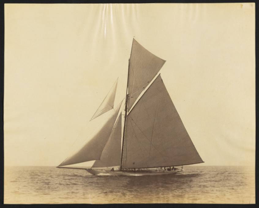 REF : 0 EDITION : 1895 DATE : 02 Aug 1895 COURSE : 0 DESCRIPTION SITE : Goelet Cup, Newport; N. L. Stebbins took photos from the Amadis (Boston Globe, Aug. 3, 1895, p. 1-2). Volunteer won the slop class (after Defender had been disabled by a broken gaff); Emerald the schooner class.Defender, designed and built in 1895 by N. G. Herreshoff to defend the America's Cup against Valkyrie III. Her bottom was polished bronze, but her topsides, deck beams, and some of her deck framing were aluminum (making her a giant battery with electrolys NOTES AMERICA-SCOOP :DEFENDER BREAKS DOWN; Snapped a Hollow Gaff in Goelet Cup Races. VIGILANT THEN SECURED THE PRIZE Defender Was Well Ahead When the Accident Happened and Would Have Won. JUBILEE BEATEN BY THE VIGILANT The Cup Defender Again Shows Her Superiority.NEWPORT, R.I., Aug. 2. -- George J. Gould has won a Goelet cup with his yacht Vigilant. She was in luck to-day, and won the much-coveted trophy through the Defender's breaking down. The Defender had led all around the course, and was only five miles from the finish when her gaff snapped just about the middle of the spar, and she was put out of the race. LICENCE :Public domain |