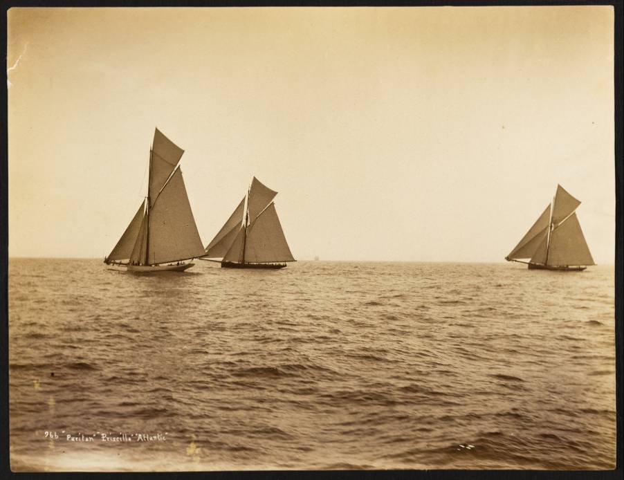 REF : 0 EDITION : 1885 DATE : 15 Jun 1886 COURSE : 0 DESCRIPTION SITE : Puritan was a wooden centerboard sloop designed by E. Burgess and built by Lawley in 1885 as a successful America's Cup defender. LOA 94ft, LWL 81-1.5ft. Priscilla was an iron centerboard sloop designed by A. Cary Smith and built by Harlan & Hollingsworth in 1885 as an unsuccessful defense candidate for that year's America's Cup races. LOA 96- 1ft. LWL 85ft. Atlantic was a wooden centerboard sloop designed by Philip Ellsworth and built by John F. Mumm of New York in 1886 as an unsuccessful defense candidate for that year's America's Cup races. Atlantic Yacht Club regatta. Puritan was not timed after drifting over the finish line on the wrong side of the judge's boat. NOTES AMERICA-SCOOP :LICENCE : Public domain |