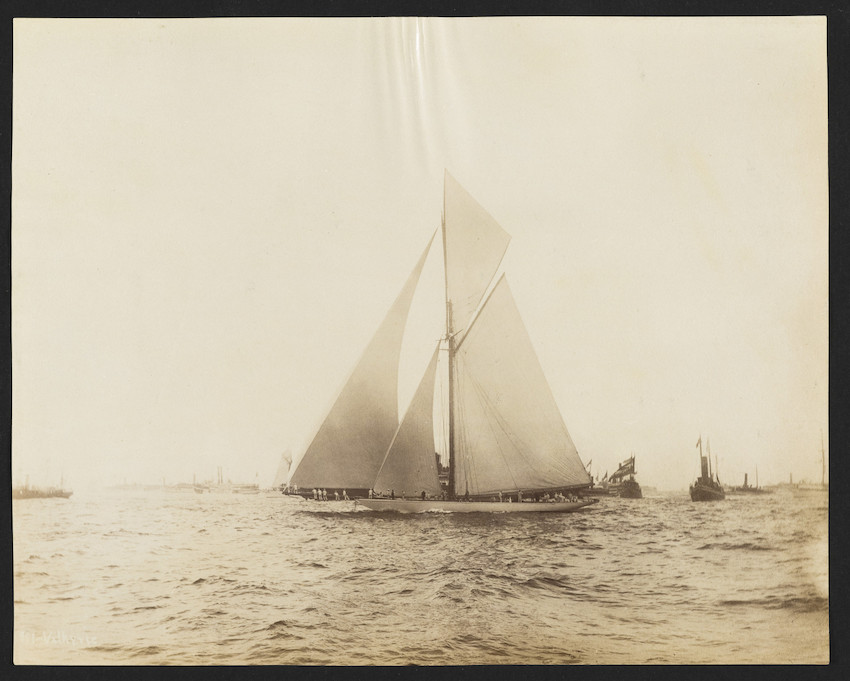 REF : 0 EDITION : 1895 DATE : 07 Sep 1895 - 17:08 COURSE : 1 DESCRIPTION SITE : First America's Cup race between Defender & Valkyrie III, Defender wonValkyrie III, designed by Watson in 1894/1895; a rather wide boat compared to the 1893 Valkyrie II from where she can be distinguished always because she had her martingale, or bobstay spreader, attached to the bowsprit some two feet forward of the stem NOTES AMERICA-SCOOP :DEFENDER WINS THE FIRST CUP RACE;