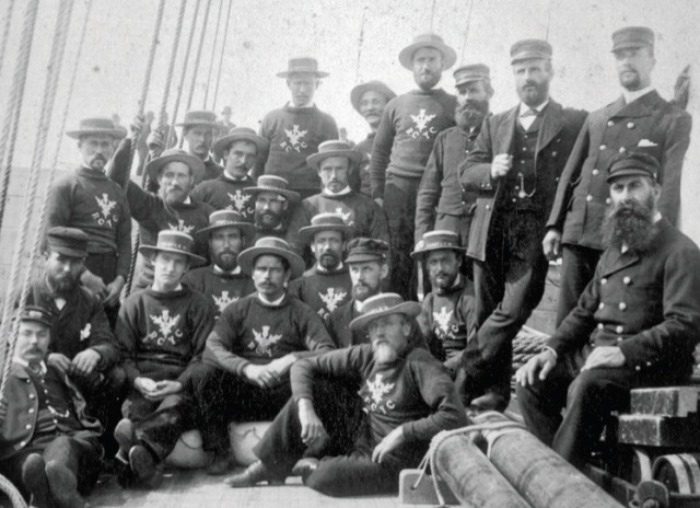 REF : 0 EDITION : 1887 DATE : COURSE : 0 DESCRIPTION SITE : Jaggy bunnets, Erie Basin, New York, September 1887: Thistle's hands are decked-out in sennet hats, and suitably emblazoned ganseys. Her hirsute skipper, John Barr, is sitting, right. But is his soon to become very famous half-brother, Charlie here? And is your forbear too? Archibald McNicol, the author's great-grandfather, from St Catherines, Loch Fyne, Argyll, is the white-faced lad sitting 2nd from left on a cushion – the only clean-shaven one. Is that Charlie Barr, and his piercing eyes, sitting to his left? Or is he standing, 4th from left? NOTES AMERICA-SCOOP :LICENCE : Public domain |