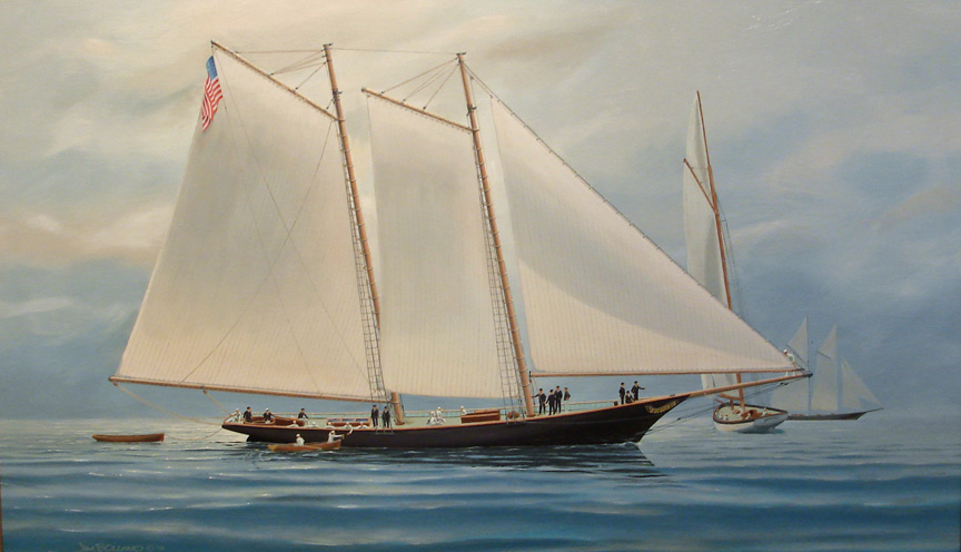 REF : 0 EDITION : 1851 DATE : COURSE : 0 DESCRIPTION SITE : The schooner yacht "America" faced e daunting task of crossing the Atlantic Ocean before indelibly marking sporting history with her deed in British waters in 1851. There is quite a tale told about "America" before her proudly American crew won the 100 guineas trophy from the Royal Yacht Squadron. The painting "GHOSTING" relates to the period before the black schooners exploits gave birth to the most excessive sporting lust; the desire to win the "America's Cup"! Original oil on canvas; signed & dated by the artist. NOTES AMERICA-SCOOP :LICENCE : Autorisation en cours |