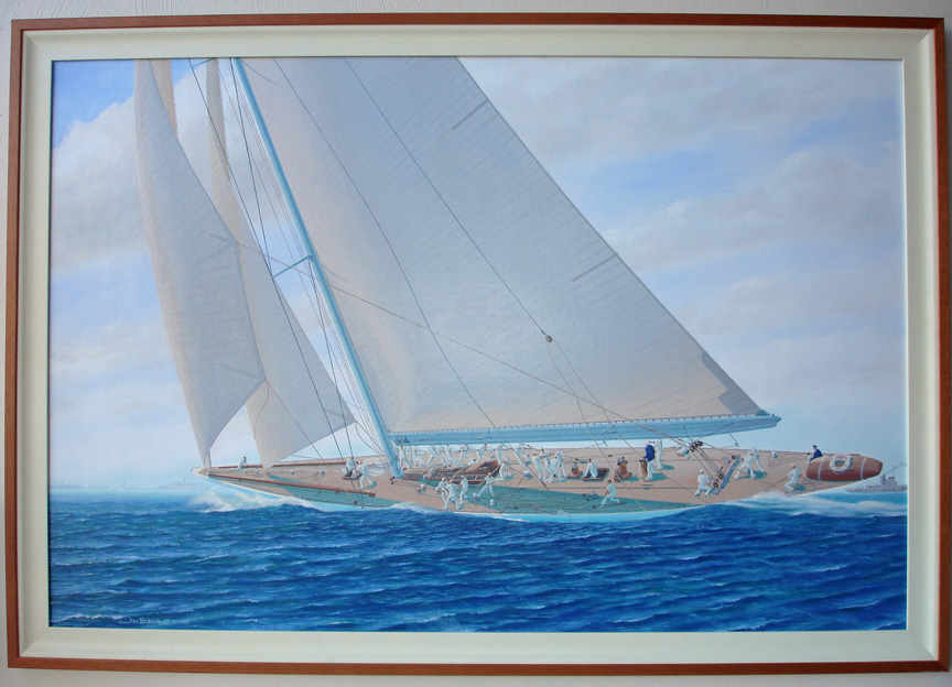 REF : 0 EDITION : 1937 DATE : 04 Aug 1937 - 14:44 COURSE : 3 DESCRIPTION SITE : In this painting Harold S.Vanderbilt's 1937 America's Cup defender "Ranger" has just swept majestically around the leeward mark of the third race of what was destined to be the last contest for the 'Auld Mug' before the outbreak of World War II. This truly dominant J Class yacht was; at this stage of the race; at least three minutes ahead of the British challenger; the "Endeavor II." But the crew of the defending yacht were keeping to their high work rate to ensure that the next day would see their fourth consecutive win and ensure that the Cup would remain at the New York Yacht Club. The J Class were beautiful big brutes that relied on much physical effort and crew skill to trim their huge sails. Vanderbilt brought a new meaning to crew efficiency and his three America's Cup victories owed a lot to the skill of his crew and their attitude of co-operation. There was no 'them and us' attitude between the after guard and the rest of the crew. RANGER was not only the greatest but also sadly; the last of the beautiful J Class. Oil on canvas board; framed: 47" x 33" NOTES AMERICA-SCOOP :LICENCE : Autorisation en cours |