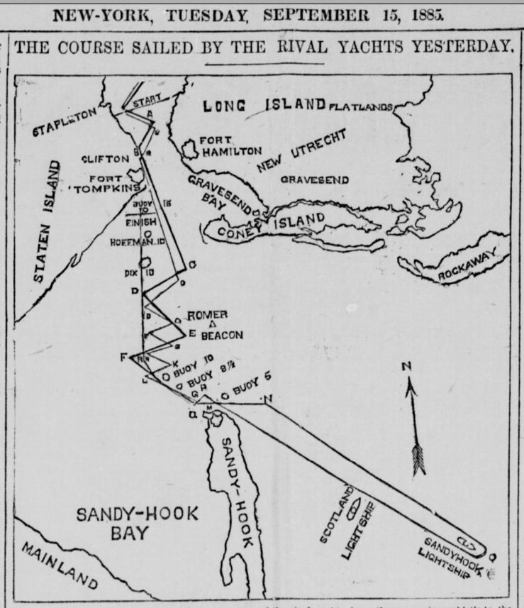 REF : 0 EDITION : 1885 DATE : 14 Sep 1885 COURSE : 1 DESCRIPTION SITE : The course was the " inside " one, starting off Owl's Head, on the Bay Ridge shore, and going out to Sandy Hook lightship and back, a distance of thirty-eight nautical miles. NOTES AMERICA-SCOOP :THE COURSE SAILED BY THE RIVAL YACHTS YESTERDAYThe above chart shows in exact detail the movements of the rival yachts from the preparatory whistle to the finish. When the first whistle blew the yachts were playing around between Bay Ridge and Stapleton. They promptly began to work for position. The Puritan got to ...windward and crept down slowly and cautiously with the Genesta on her starboard side. When the whistle to start blew both boats tacke, filled and walked up to the line. In the above cut, the Puritan course is indicated by the lighter line and Genesta by the darker. Having got across, they sailed abreast,the Genesta tacking at 10:27:30 and the Puritan immediately after. They stood over for Clifton, the Puritan running closer to the wind than her rival. At 10:46:07 the Yankee boat tacked, and thirteen seconds later the Genesta followed (at b and B). The leg was a long one, reaching to a point at C below Dix Island. The Puritan drew away from the cutter gradually and tacked at c at 12:05. The Genesta tacked twelve twelve minutes after.From then till she rounded the buoys the Puritan made extremely short tacks, going about at d at 12:19, at e at 12:32:16, at f at 12:40:45, at g at 12:53, at h at 1:02:30, at k at 1:06:30' atl at 1:16. She then took a port tack to M, passing the buoys No. 10 and No. 81/2. After tacking at C the Genesta followed an entirely different route. She made longer stretches than the Puritan, going about at D at 12:31:40, at E at 12:49, at F at 1:05, from which point she rounded the buoys. At the point M the Genesta drew into the Puritan's wake, or so nearly there that a distinghishing line cannot be shown on this chart. There was then four minutes and ten seconds difference in their time. Their course to and around the Sandy Hook Lightship, which the Yankee boat rounded at 2:14:54 and the Genesta at 2:19:16, was almost identical, and thence back there was but a slight difference till they tacked from P to Q. The Genesta stood in toward the Hook mch further than the sloop. After rounding the buoys till the finish line was made their course was so nearly a common one that the difference cannot be shown. The Puritan finished at 4:38:05 and the Genesta at 4:54:52. Autorisation en cours |