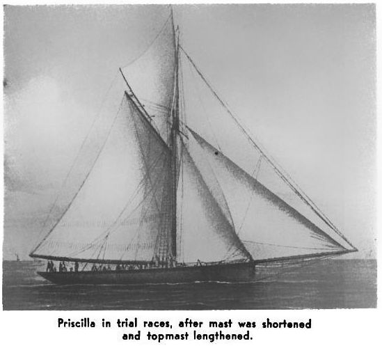Priscilla in trial races after mast was shortened and topmast lengthened.