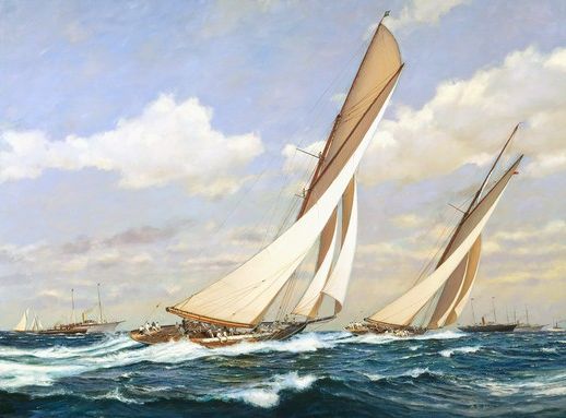 REF : 0 EDITION : 1899 DATE : 20 Oct 1899 - 12:30 COURSE : 8 DESCRIPTION SITE : Columbia leads Shamrock. America's Cup, October 20th 1899.' Oil on canvas, 30' x 40', 2002 . The third and final race for the America's Cup of 1899 NOTES AMERICA-SCOOP :THE AMERICA'S CUP WILL REMAIN HERE; Columbia Makes it Three Straight from Shamrock. WON BY OVER SIX MINUTESNEWPORT, R.I., Oct. 20. -- The cup is safe, and Columbia is the gem of the ocean. The yachting supremacy of the United States is just where it was before the formidable Shamrock was turned out of the brain of Will Fife of Fairlie, and there is a place for another challenger as soon as one can be found who will undertake the task of "lifting" the cup.... LICENCE :Autorisation de l'auteur acceptée le 28/03/2019 |