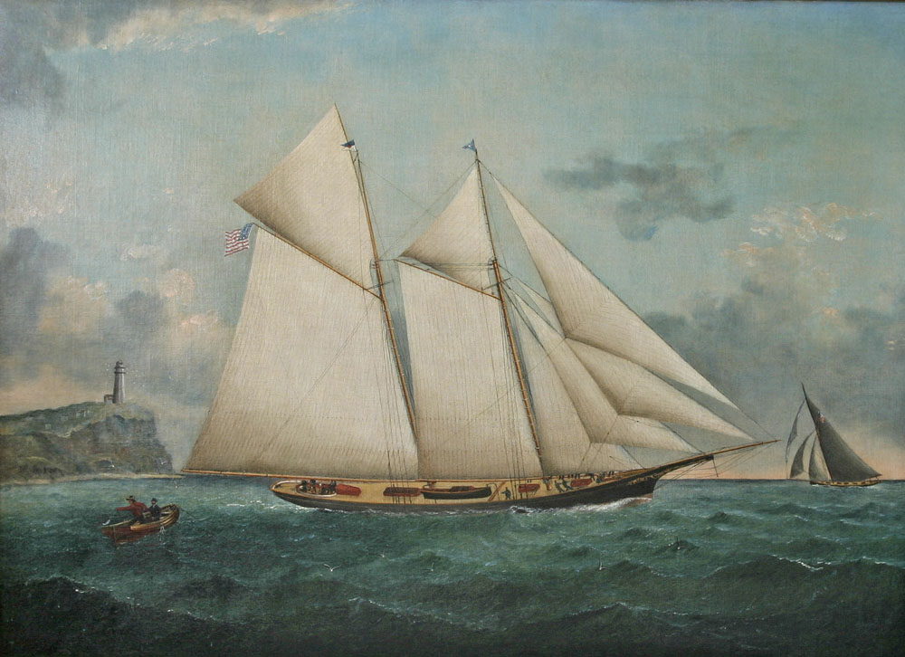 American Schooner Columbia Before Block Island, by William G. Yorke A view of the American Racing Yacht Columbia passing the important Block Island Lighthouse, Rhode Island. Columbia belongs to the elite class of big schooners built in the decade following the end of the American Civil War. She launched in 1871 out of designer Joseph Van Deusen’s Chester, Pennsylvania Yard for Franklin Osgood of the New York Yacht Club.