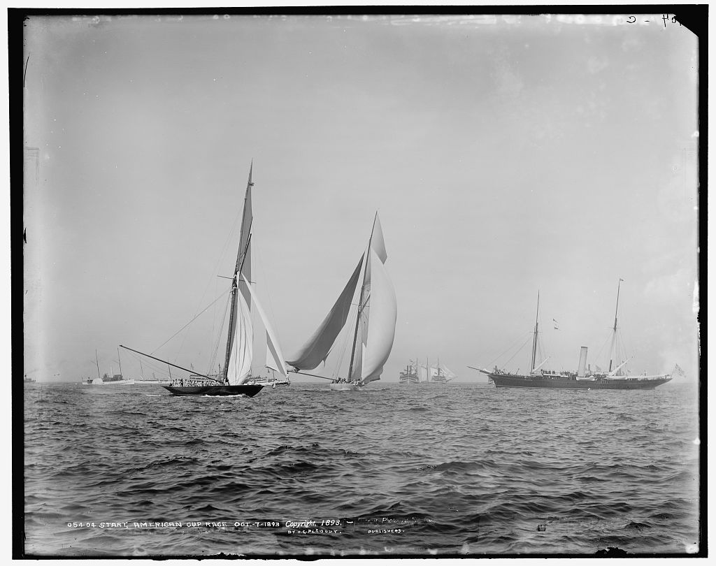REF : 0 EDITION : 1893 DATE : 07 Oct 1893 - 11:25 COURSE : 2 DESCRIPTION SITE : The first decisive race was sailed October 7th, it being as before over a thirty-mile course, but laid to leeward and windward. The wind at the start was moderate W. by N., later shifting to S. W., making a broad reach on the first leg, and a close lay home, over a rolling sea. The start was made with loftiest club-topsails on, and all light canvas ready for use. The boats went over promptly after gunfire, with only five seconds between them, Valkyrie's time being 11.25.25 and Vigilant's 11.25.30. Both broke out spinnakers as they crossed, and slipped easily off under a cloud of white cloth before the six-knot breeze. NOTES AMERICA-SCOOP :LICENCE : Public domain |