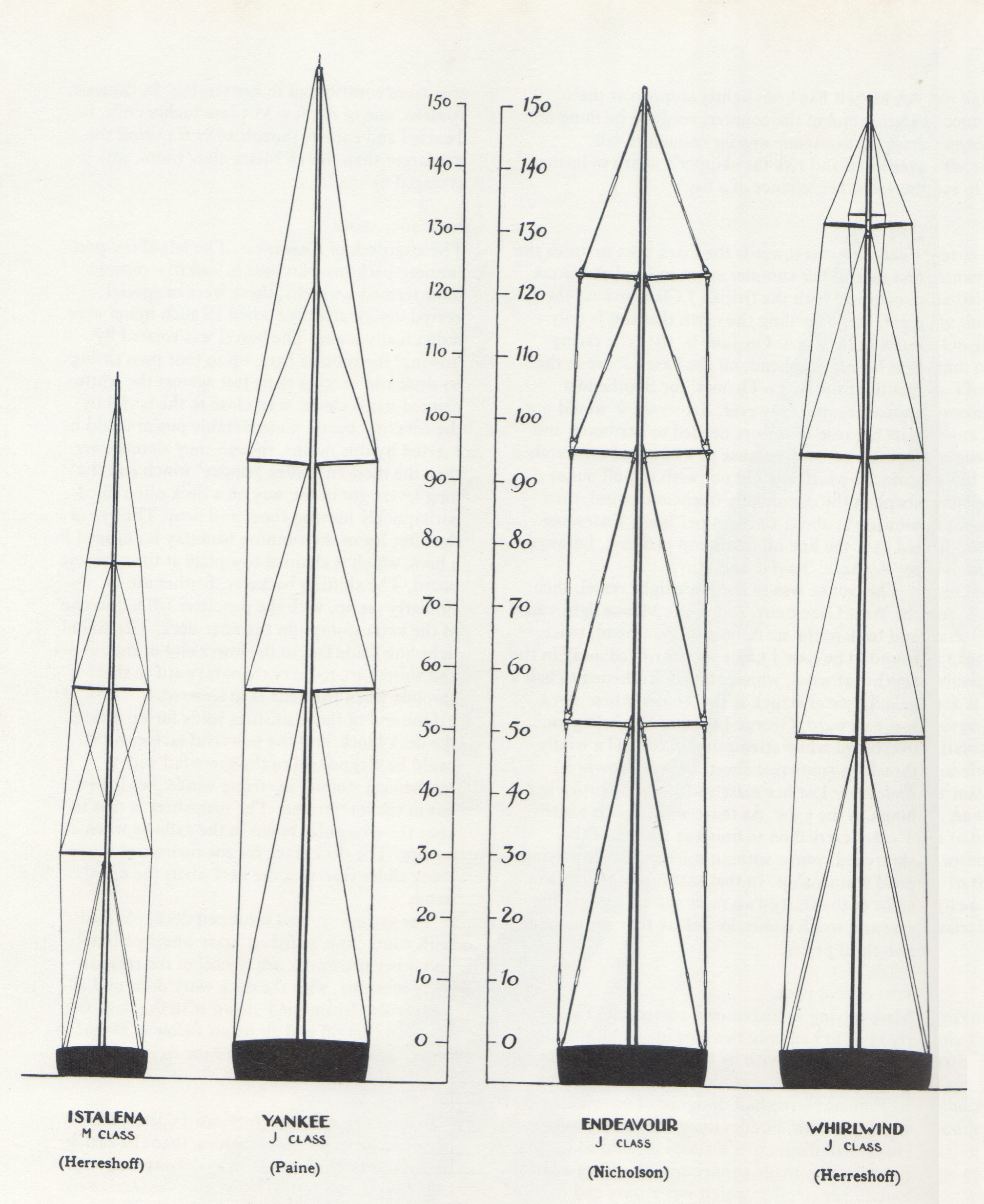 Mast stay arrangements compared. Yankee's rig in 1930 had only two spreaders and the long masthead stood with its topmast shrouds but without an upper spreader or jump strut.